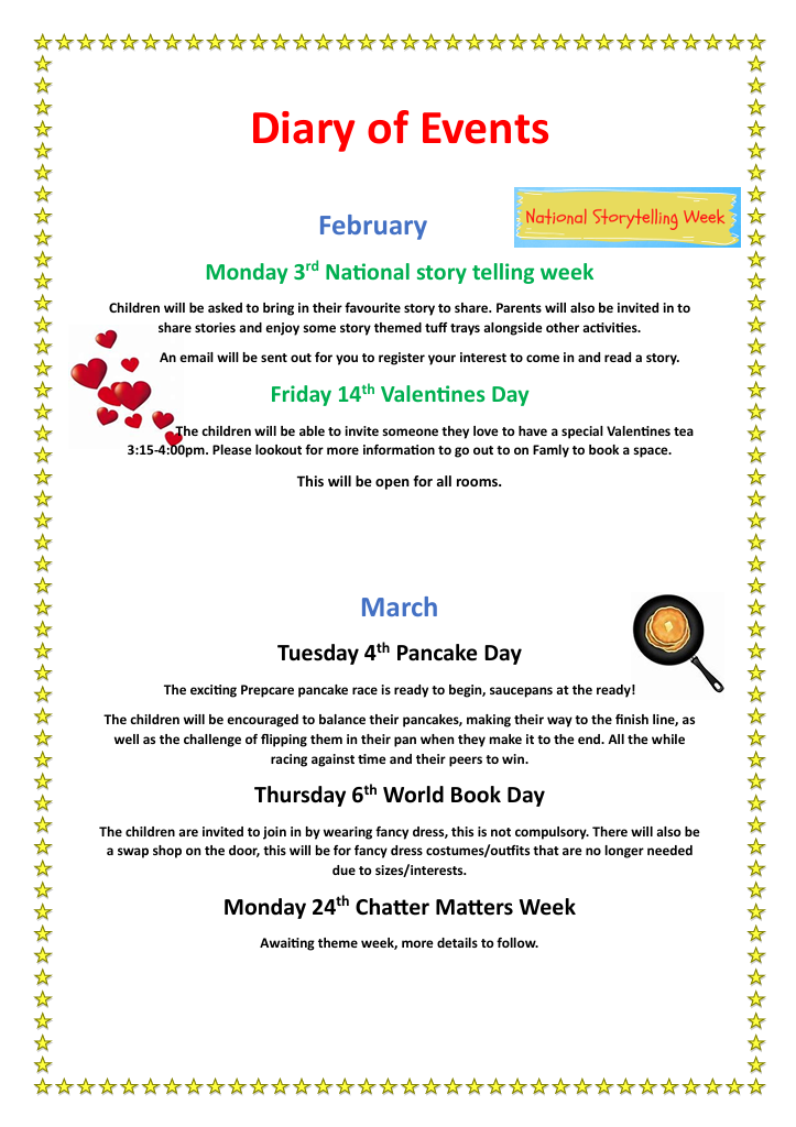 Rugby Prepcare Day NurseryDiary of Events 2025 Click Here To Download Our Diary EventsFebruaryMonday 3rd National story telling weekChildren will be asked to bring in their favourite story to share. Parents will also be invited in to share stories and enjoy some story themed tuff trays alongside other activities. An email will be sent out for you to register your interest to come in and read a story. Friday 14th Valentines DayThe children will be able to invite someone they love to have a special Valentines tea 3:15-4:00pm. Please lookout for more information to go out to on Famly to book a space. This will be open for all rooms.